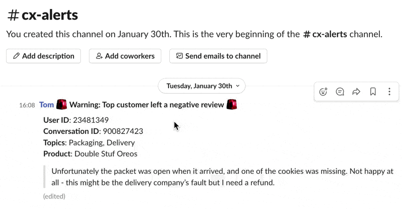 As soon as a negative review from a top customer customer appears, we send an instant alert to your favourite tooling (e.g. Slack). This means no critical feedback slips through the cracks. Your team are empowered to act promptly.By receiving these immediate updates, your customer service team can quickly engage with the dissatisfied customer. This rapid response is crucial for addressing their concerns, resolving any issues, and ultimately turning a potentially negative experience into a positive one.